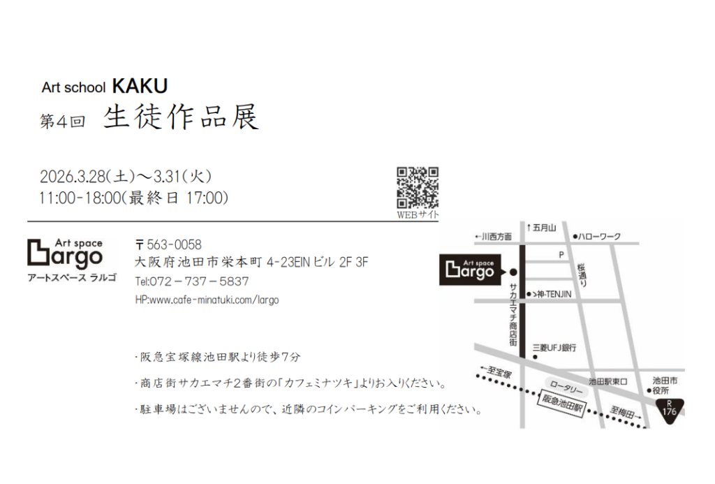 今年も、アートスペースlargoさんのギャラリースペースをお借りして、生徒作品展を開催します。